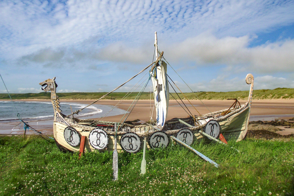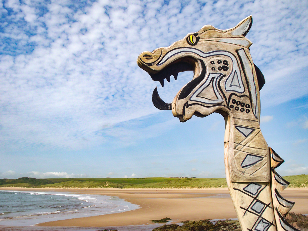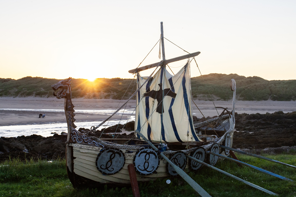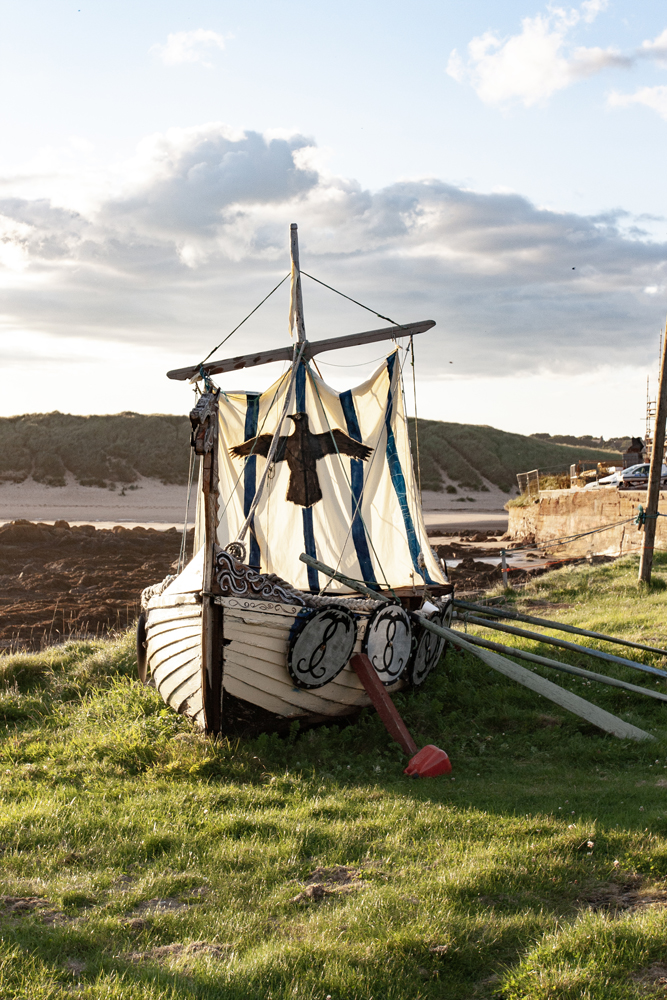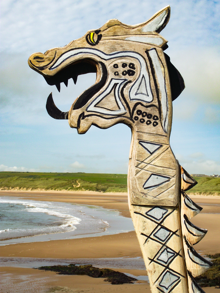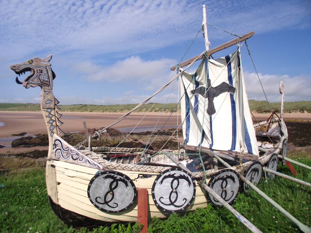 Derek Thomson, the Harbour Master at Port Erroll Harbour spent many hours constructing the longship. adding many special touches. Everything was constructed from recycled materials and Derk designed and cu tout freehand the artwork for the magnificent head and the tail of the boat.