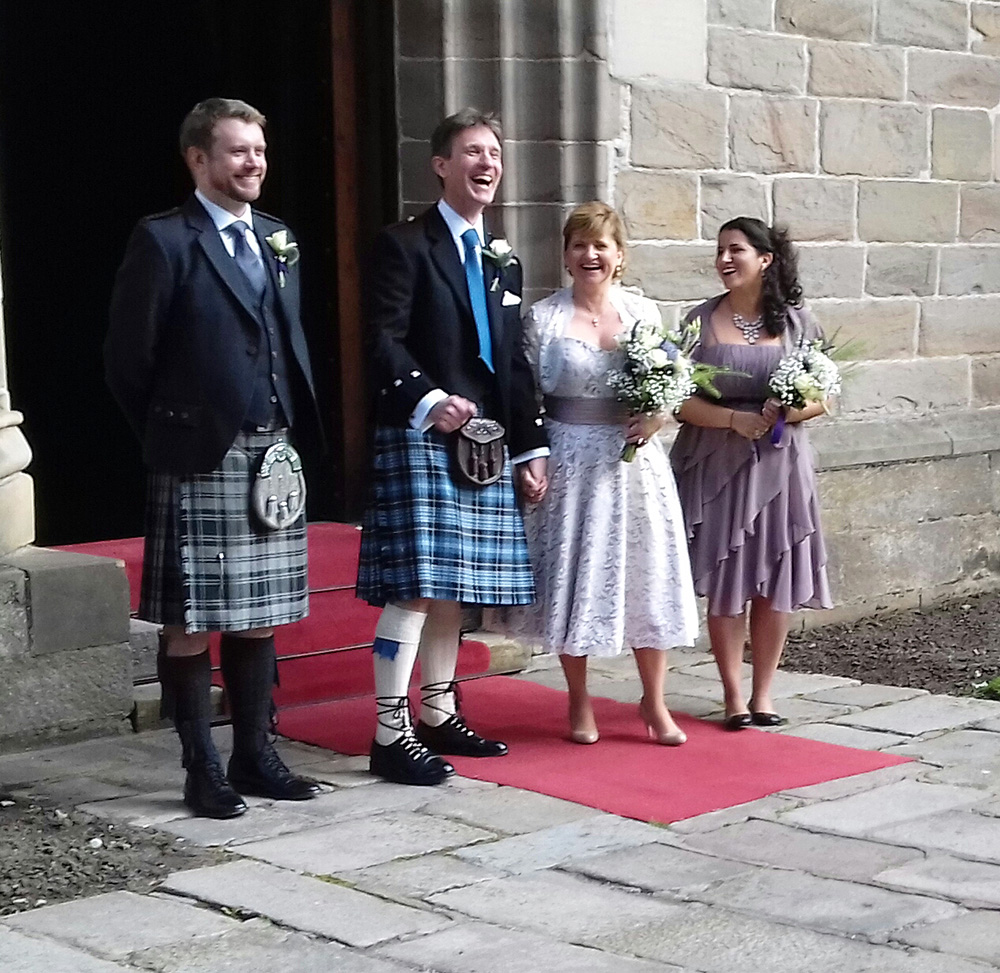 John Lamb, a former elder of Cruden Church, was married in King's College Chapel in Aberdeen on 29th July. His bride is Marie-Christine Noguera from France. John's best man is his brother David. The photograph shows how very happy John and his bride were on the day.