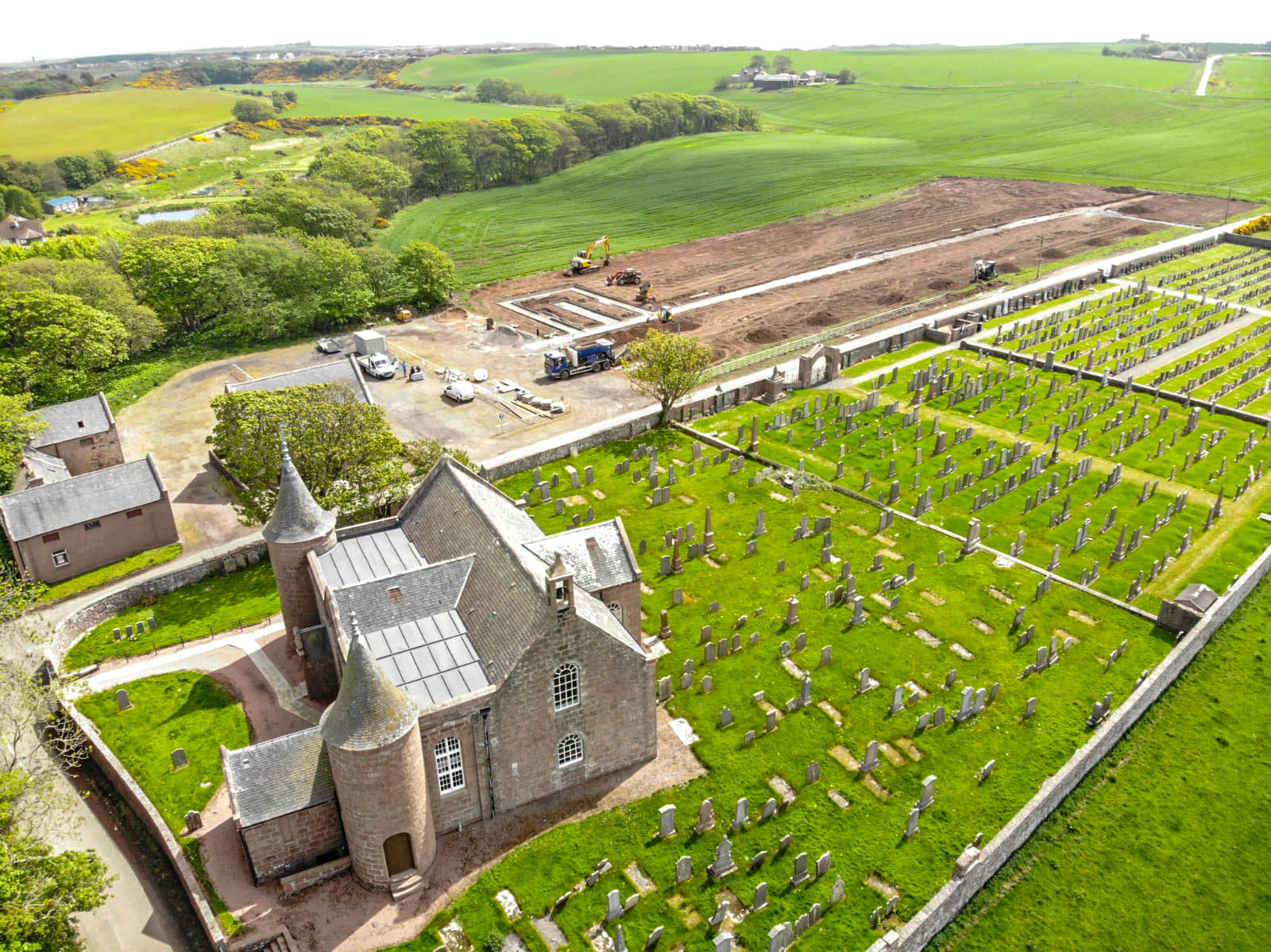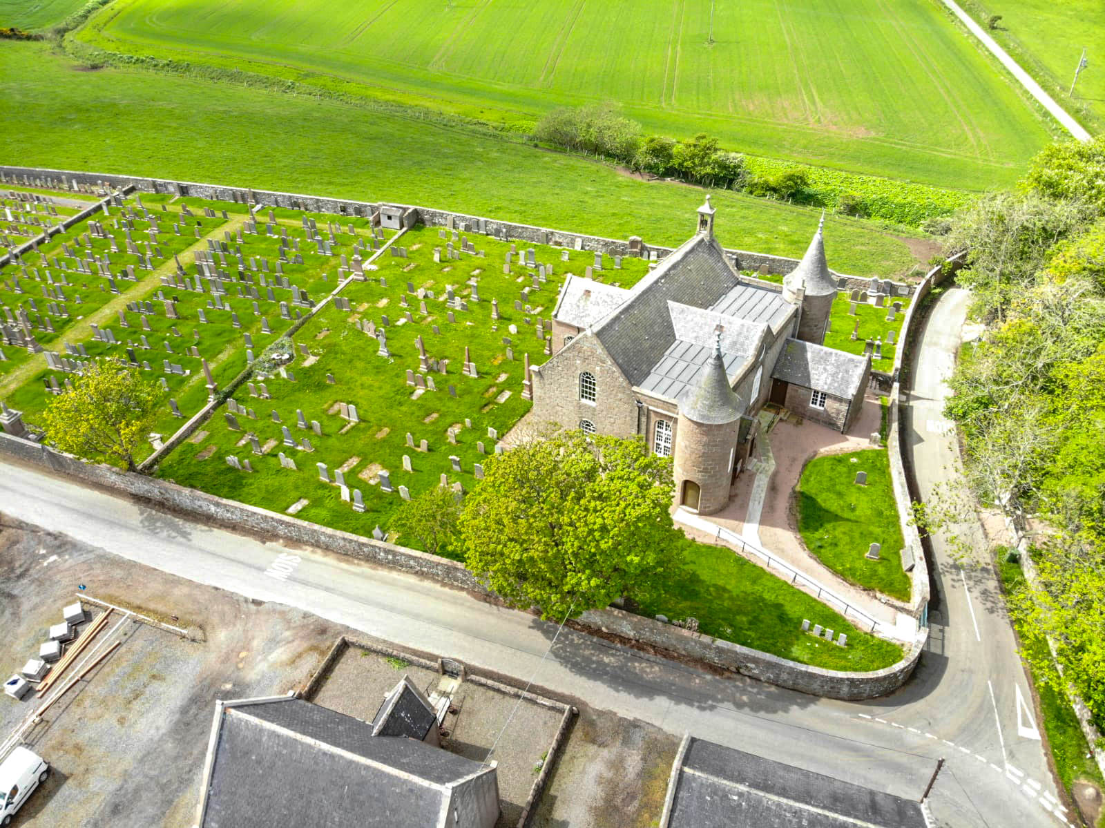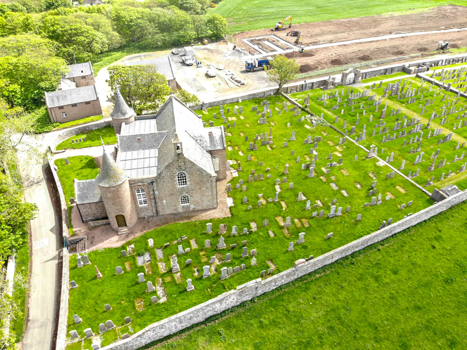 George Jamieson, the contractor for the new cemetery extension, has provioded us with these wonderful pictures of Cruden Parish Church from above taken from a drone. (31 May 2020)