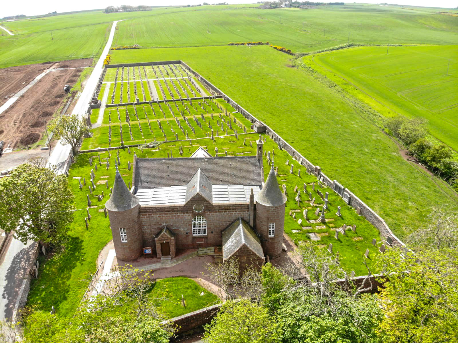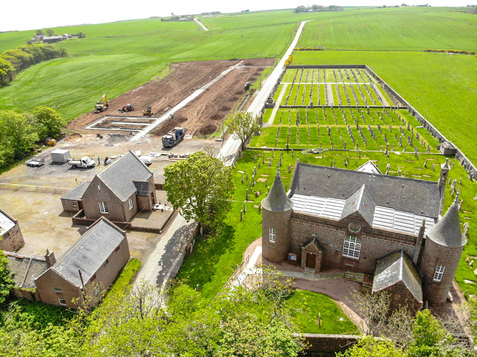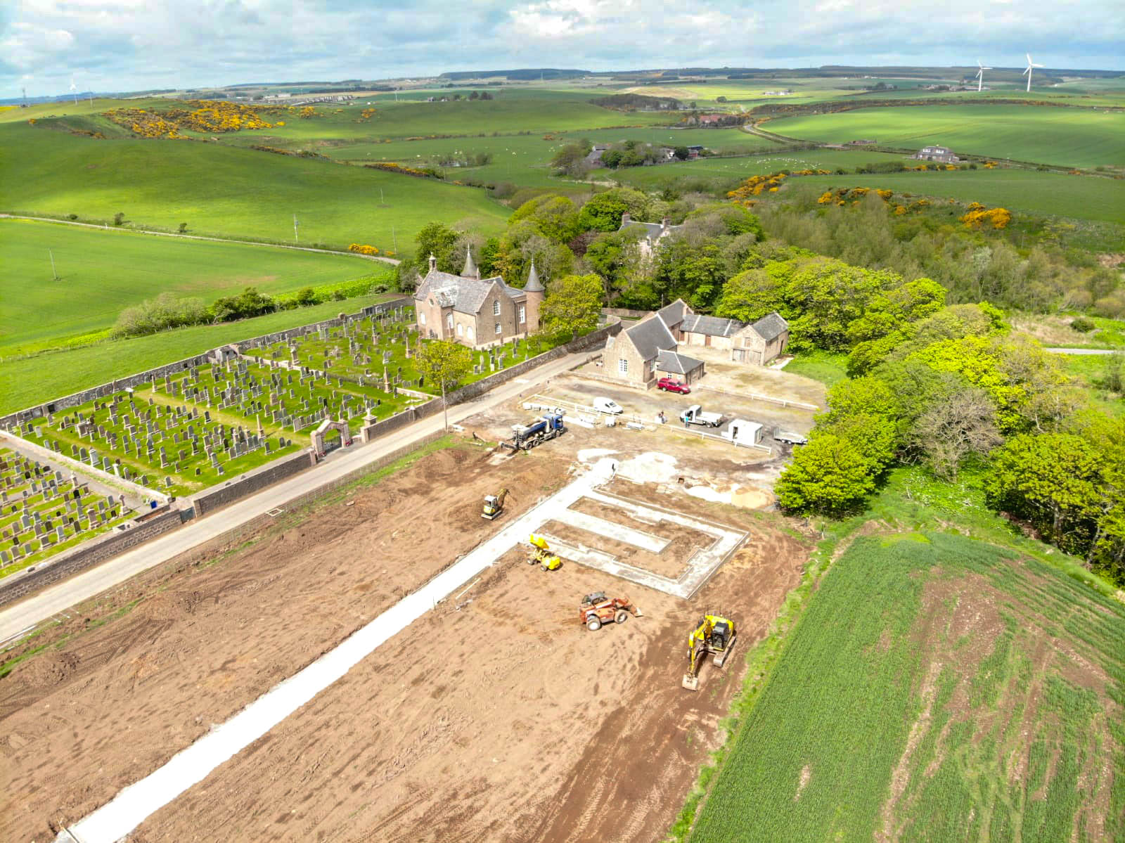 George Jamieson, the contractor for the new cemetery extension, has provioded us with these wonderful pictures of Cruden Parish Church from above taken from a drone. (31 May 2020)