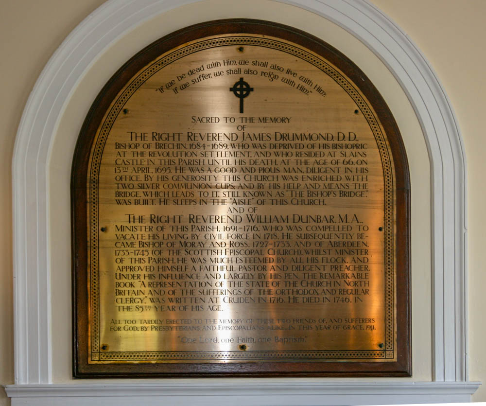 was Bishop of Brechin from 1684 to 1689. He was ejected by the victory of Presbyterianism and retired to stay in Slains Castle until he died in 1695. By his generosity the church was enriched with two silver communion cups, and he initiated the building of the bridge leading to the church which is still known as "The Bishop's Bridge."