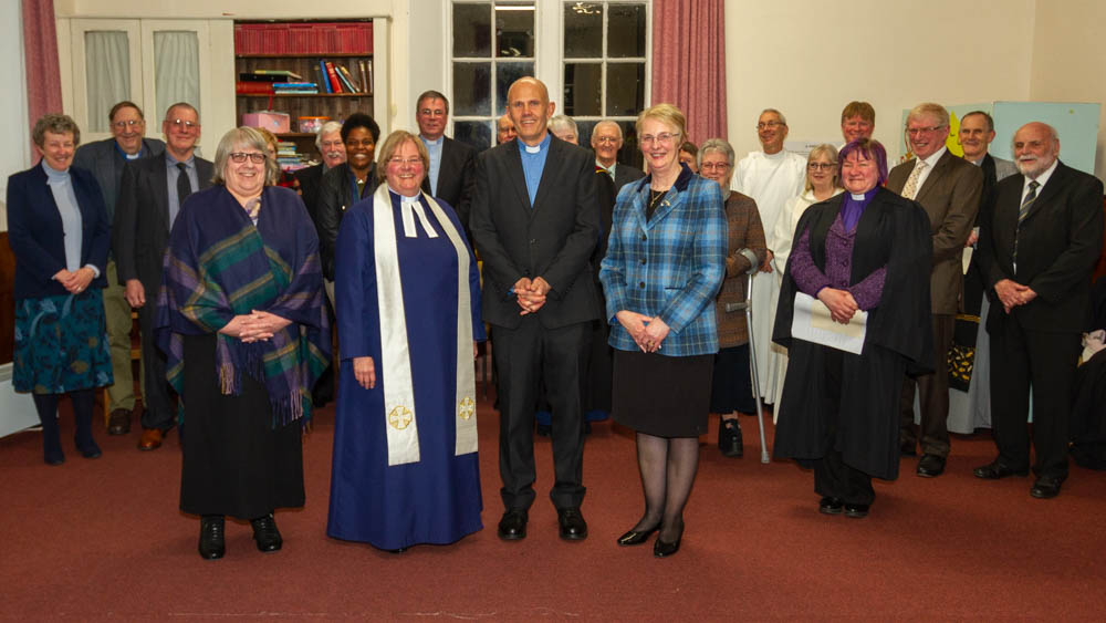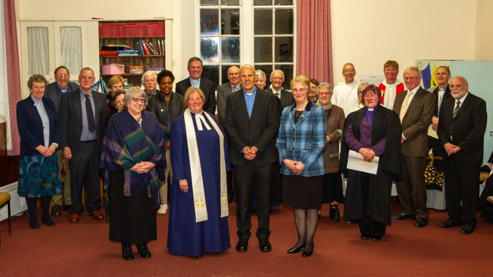 Left to right: Ms Ali Macleod (Interim Moderator), Rev Sheila Kirk (Presbytery Clerk), Rev Sean Swindells, Mrs Maureen Esson (Moderator) Members of Presbytery and guests are behind.
