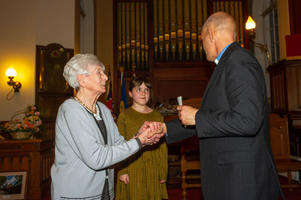 Mrs Betty Morris, the oldest member of the congregation made a presentation to the new minister.